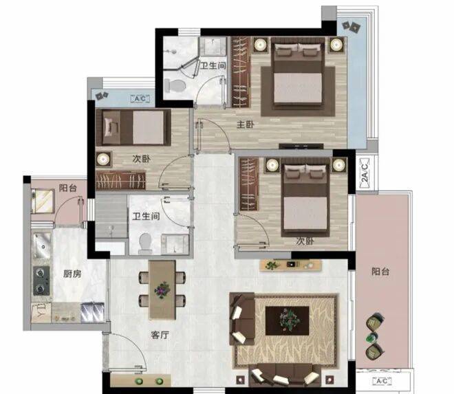 约88平方米户型:对流通透的设计,餐客一体化,宽景大阳台提供良好的视野。主卧带套房及约270°转角飘窗,增加居住舒适度与观景体验。