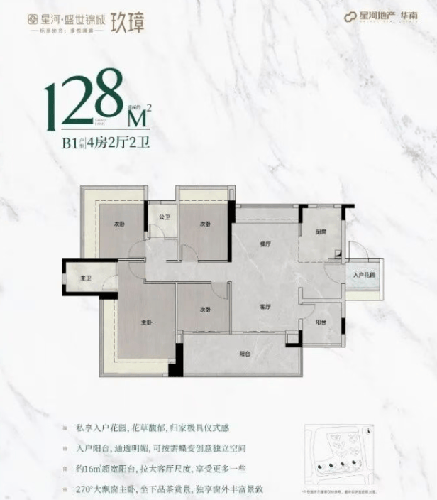128㎡户型:这是三期中的终极改善产品。相比二期的136㎡户型,128㎡户型在空间利用上更加高效。独立入户花园设计,不仅增加了鞋柜的置物面积,更让归家的第一刻便感受到温馨与舒适。厨房、客餐厅和主卧的尺度大幅提升,带来宽敞明亮的烹饪空间、舒适宜人的用餐和起居环境,以及豪华大气的主卧套房。全屋精装品质全面提升,从客餐厅到卧室,从厨房到卫生间,每一个细节都精心打磨。
