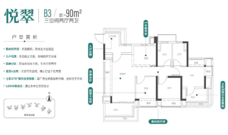 90平方米三房两厅两卫:紧凑实用,适合刚需家庭。