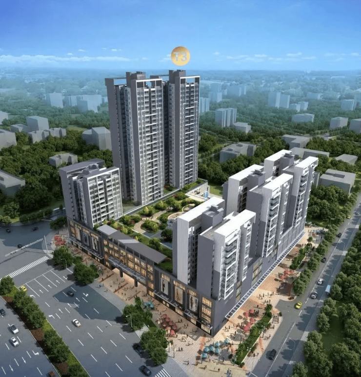 项目整体占地约2万㎡,总建筑面积约16万㎡,规划布局科学合理,实现了商业与住宅的完美分区。其中,1-3层为自持商业体,建面约3.3万㎡,未来将引入超市、餐饮、休闲娱乐等多元化业态,满足业主一站式生活消费需求;4层为空中花园,面积约4000㎡,配备儿童游乐设施、环形健身跑道、绿植景观等,为业主打造专属的空中休闲秘境;之上规划建设6栋住宅楼,目前在售T1、T2、T4、T5四栋,均为平层产品,户型涵盖77-128㎡二至3+1房,带装修交付,满足不同家庭的居住需求。