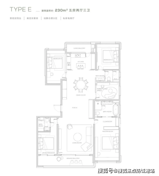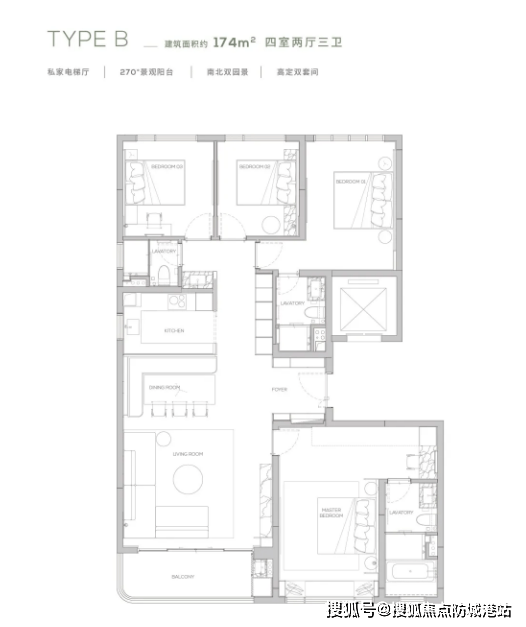 目前在售户型主打大户型,圈层纯粹,其中核心户型为168㎡四叶草户型,设计为四室两厅三卫,户型布局合理,空间利用率高,四叶草布局确保每个房间私密性,互不干扰,适配多人口家庭居住。同时户型配备M+科技系统,以绿色健康为依托,从空气、饮水、环境等核心要素出发,每个空间都采用优质的材料和工艺进行独特设计,满足现代智慧社区与智能生活的极致体验。