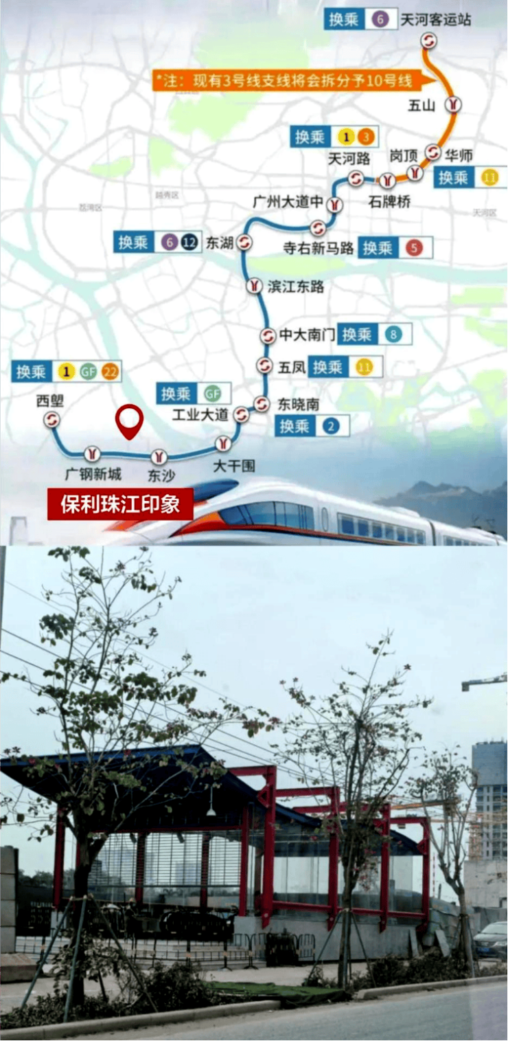 先来说大家最关心的地铁——项目距离在建的地铁10号线东沙站直线仅300米,实测步行5分钟就能到达,相当于“准地铁盘”,这距离真的太香了!不用早起赶地铁,也不用在寒风暴雨里走老远,每天多睡十几分钟,幸福感直接提升一个档次。根据广州地铁集团官方公告及工程进度,地铁10号线东沙站主体结构已封顶,确定将于2025年底正式通车,通车后,从东沙站出发,6站就能直达珠江新城,全程无需换乘,不管是在珠江新城上班的白领,还是经常去珠江新城逛街、办事,都超级方便。