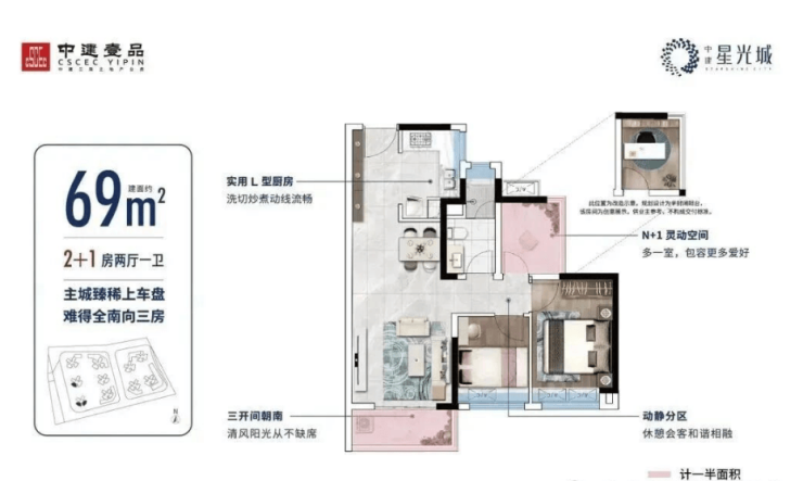 建面约69㎡三房:采用创新蝶形设计,全南向布局,实用率高达94%,为小户型提供了宽敞舒适的居住体验。