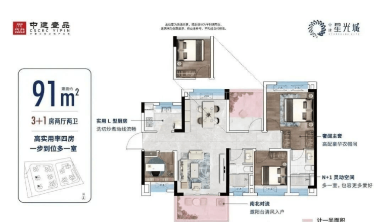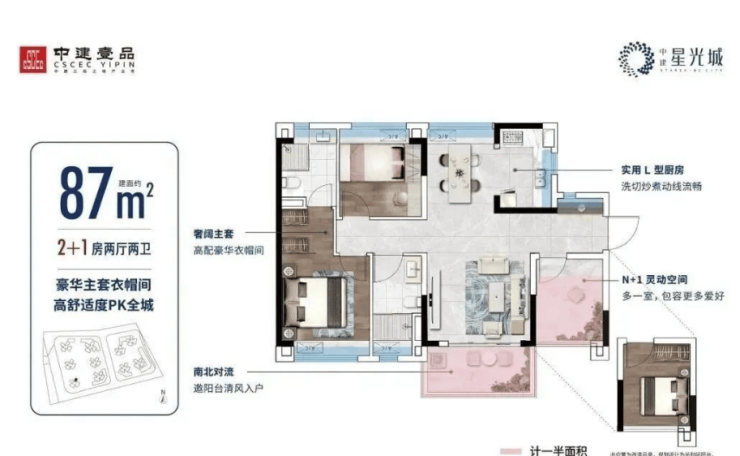 建面约87㎡大三房:南北通透设计,餐客厅一体化,提升生活品质。