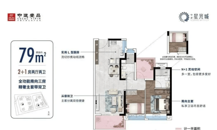 建面约79㎡三房:主套双卫设计,三开间朝南,通风采光俱佳,提供私密性强的生活空间。