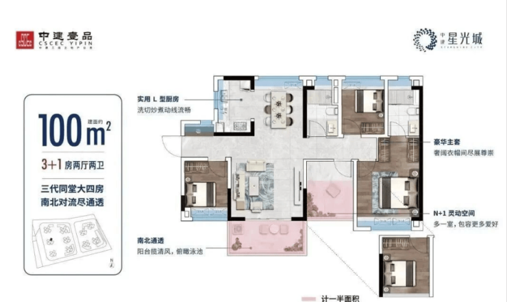 建面约100㎡四房:四开间朝南,南向大阳台瞰景,满足三代同堂的家庭需求。