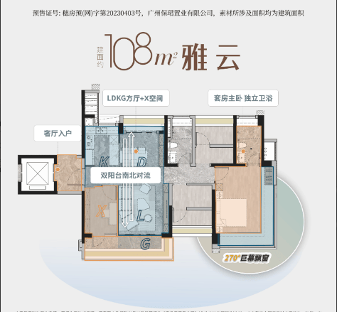 建面约108㎡:LDKG+X一体化设计,双阳台布局,270°巨幕飘窗。