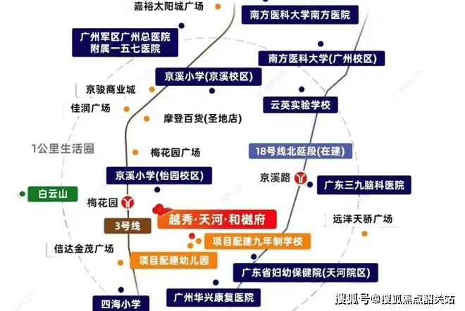 天河和樾府位于天河中轴北延段,直线距离珠江新城约6公里,车程15分钟;距离地铁3号线梅花园站约800米(步行10分钟),2026年底开通的18号线北延段(京溪路站)将进一步缩短通勤时间。