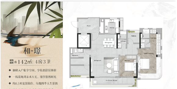 142㎡四房两卫:主打一线花地河景观,位于中轴王座。如果你预算充足,追求极致的景观和居住体验,这个户型是首选。不过要注意,138平主要集中在低层为主,高楼层的选择已经不多了。