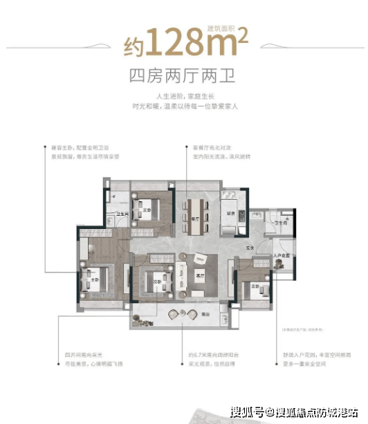 奢阔进阶大四房128㎡:四房两厅两卫设计,主打改善型需求,户型方正大气,南北对流。约6.7米南向阔绰阳台,采光观景怡然自得,站在阳台上可俯瞰社区园林美景,享受惬意居住时光;四开间南向采光,让每个房间都能拥有充足的阳光,居住更加舒适。舒适入户花园设计,多一重收纳、安全空间,可作为玄关储物区,摆放鞋子、衣物等,提升空间利用率;雍容主卧全明设计,配备独立卫生间与观景飘窗,尊享高品质生活享受,适合人口较多的改善型家庭。