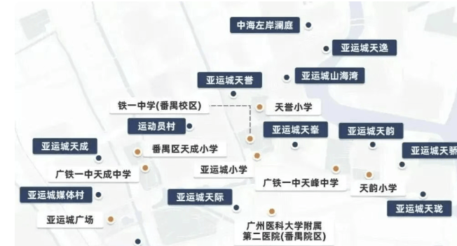 亚运城板块教育资源高度成熟。区域内已规划建设19所学校,其中18所已投入使用,涵盖幼儿园、小学、初中到高中全阶段。包括广铁一中(亚运城校区)、华南师范大学附属番禺学校等优质名校资源,孩子从启蒙到升学路径清晰,家长无需为学位焦虑。