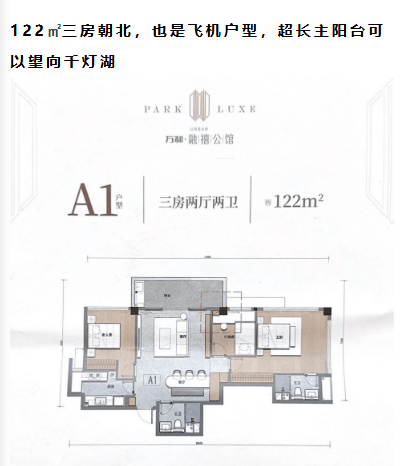 122平方米三房户型,则是为追求高品质生活的改善型家庭量身打造。该户型朝北,同样采用飞机户型设计,拥有超长主阳台,可眺望千灯湖美景,视野开阔,心旷神怡。主卧配备270度景观玻璃窗,将室外美景尽收眼底,极大提升了居住的尊贵感与舒适度。三个卧室面积宽敞,布局合理,厨房虽为狭长型,但功能完备。尽管餐厅靠近公卫,但通过巧妙的设计与装饰,可以有效化解这一问题。该户型得房率高,空间利用率极佳,是改善型置业的优选。