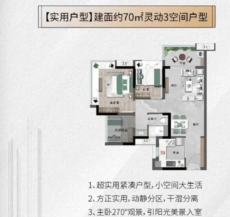 越秀逸泉锦翠深谙小户型“寸土寸金”之道,主力打造建面约70-92㎡三至四房,其中79㎡三房两卫户型堪称爆款——