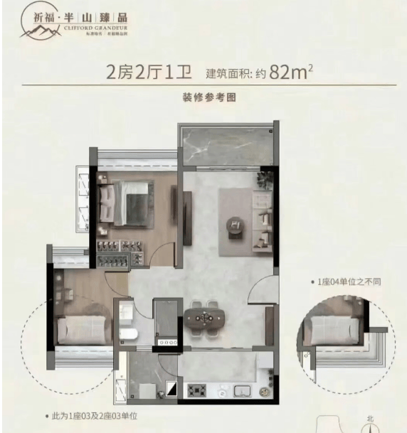 《祈福伴山臻品》虽为刚需改善定位,但户型设计堪称“教科书级别”。主力产品涵盖82㎡三房、110-121㎡四房、145㎡大四房,全部采用南北通透、双阳台(生活+景观)、动静分区布局。得益于11米整体抬高设计,低区住户也能享有开阔视野,部分高层单位直面大夫山或祈福湖景。2梯4户的配置在同价位产品中属低密,高峰期候梯时间短,私密性优于常见2梯6户。得房率高达80%,远超广州平均水平(约70-75%)。以82㎡为例,做到三房两卫+U型厨房+6.5米双阳台,空间利用率极高。对于首次置业或二胎家庭,这样的产品既控制总价,又不牺牲居住品质。