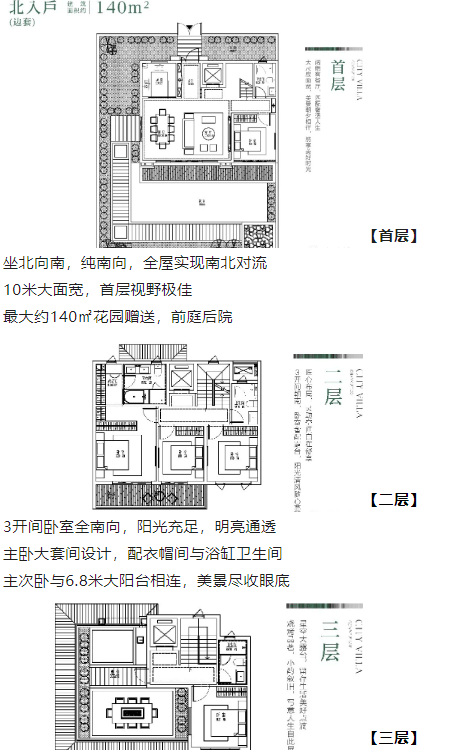 别墅产品则推出建面约 140㎡与 170㎡联排别墅,赠送率极高。140㎡联排别墅可做 5 房 4 卫,买 140㎡赠送 180-238㎡,赠送率最高达 160%。首层坐北向南,实现南北对流,10 米大面宽带来极佳视野,最大约 140㎡花园赠送,前庭后院尽显惬意;二层 3 开间卧室全南向,主卧大套间配衣帽间与浴缸卫生间,主次卧连接 6.8 米大阳台,美景尽收眼底;三层拥有最大约 33㎡全赠送星空大露台,多功能房间半赠送,拓展生活空间。170㎡联排别墅可做 5 房 5 卫(含 2 套房),买 170㎡赠送 260㎡,赠送率达 155%。首层 12 米大面宽,超大餐客厅尽显豪华,约 160㎡花园赠送,中西厨设计满足烹饪爱好;二层 3 开间卧室全南向,双套间设计保障舒适睡眠,主次卧连接 8.5 米大阳台;三层最大约 45㎡全赠送星空大露台与半赠送多功能房间,为生活增添更多可能。