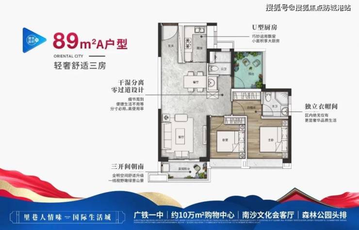 89㎡三房两卫:南北通透,主卧270°转角飘窗;