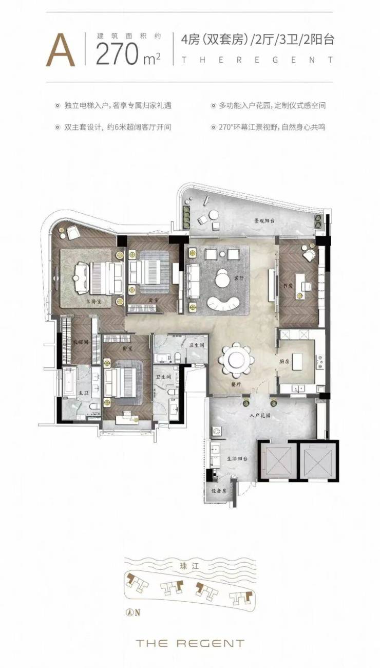 270平方米户型:面积约为270平方米,四室两厅两卫设计,空间宽敞明亮,主阳台朝南,采光通风良好,功能齐全,适合大家庭居住。