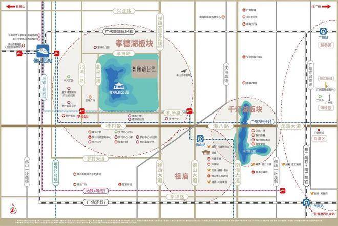 项目所在孝德湖板块,右接千灯湖CBD,左邻佛山西站枢纽新城,形成东接城市繁华、南向交通便利的独特区位优势。佛山西站枢纽新城规划面积达8.58平方公里,定位为大湾区西门户、广佛未来城以及产城融合核心区。区域内商业、文旅、酒店等多业态布局齐全,未来将建设成为全国文博新高地和文化新标杆,为南海乃至佛山经济发展提供强有力支撑。项目周边2高铁、2轻轨、4地铁的立体交通网络,让业主享受便捷通勤,佛山西站作为国内最大的下进下出式高铁站,进一步强化区域交通枢纽价值。