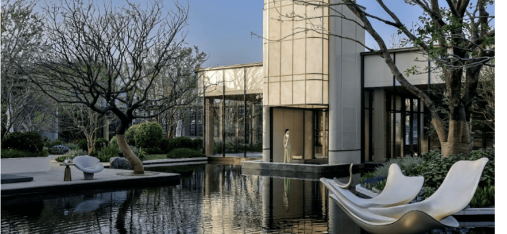 园林设计由全球顶尖景观设计团队打造,以“安缦酒店”为蓝本,打造了约1000㎡的泠汀水院和约1500㎡的林下浮岛花园。设计上复刻了CHANEL水上秀场的经典场景,利用墨玉水盘、琉璃光塔、宣纸玻璃等珍稀材质,营造出“踏水归家”的尊贵仪式感。社区内还配备了近1000㎡的无边际泳池、约600㎡的儿童游乐天地以及专属的老年康体区,真正实现了全龄段的景观覆盖。特别是那个被称为“悬浮盒子”的隐心茶坞,四周被原生朴树环绕,是业主冥想、阅读的最佳私密空间。