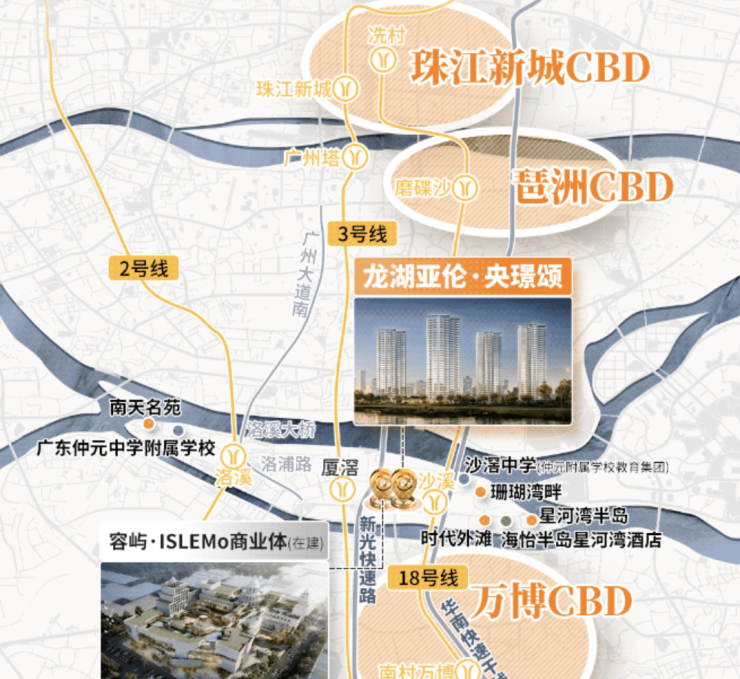 项目位于迎宾路与沙溪大道交汇处,距离珠江后航道仅约200米。这里是广州城市中轴南延线上唯一的江心岛板块,且是断供长达10年后的首宗出让宅地。这种“岛+江”的双重景观资源,在广州主城区已近乎绝版。相比珠江新城的高密拥堵,这里更像是一座离尘不离城的世外桃源,既能享受一线江景的壮阔,又能通过18号线快速接入城市核心脉络。