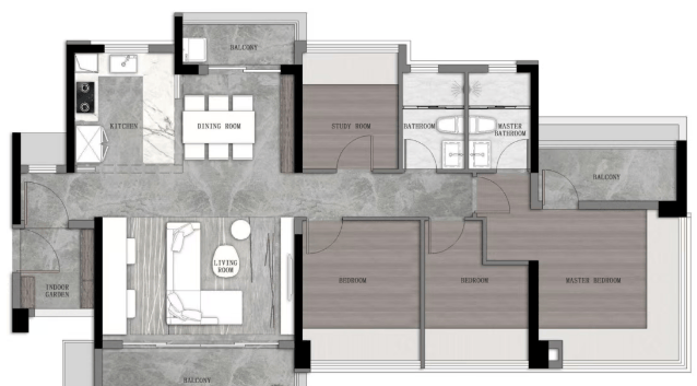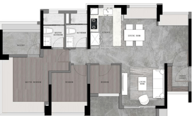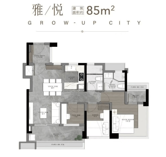 特点:南向4开间设计,约11.1米采光,跑道式阳台,270°无立柱景观飘窗,阳光衣帽间,适合小家庭居住。