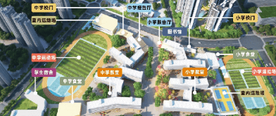 项目配备一所9班规模的幼儿园,以及42班小学和36班初中,共计提供3600个学位,超过业主户数(2577户)。