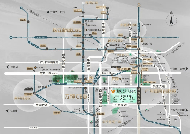 自驾通过兴业大道/南大干线,可以快速到达万博CBD和广州南站;南沙港快速、新化快速、番禺大道无缝连接珠江新城,经金光东隧道速达大学城一期。