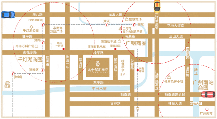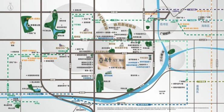 越秀星汇瀚府位于广佛同城的核心地带——映月新城和千灯湖交汇处。项目周边有三地铁贯穿,包括已开通的广佛线南桂路站、规划中的佛山地铁6号线桂平路站以及在建的南海新交通有轨电车夏东站。此外,从项目出发仅需400米即可上佛山一环,便捷通达广州荔湾等地,交通十分便利。