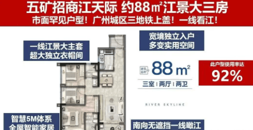 独特的江景资源:五矿招商江天际的最大亮点在于其独特的一线江景资源,距离珠江仅40米,这种稀缺的自然资源不仅提升了居住品质,也赋予了项目更高的价值。