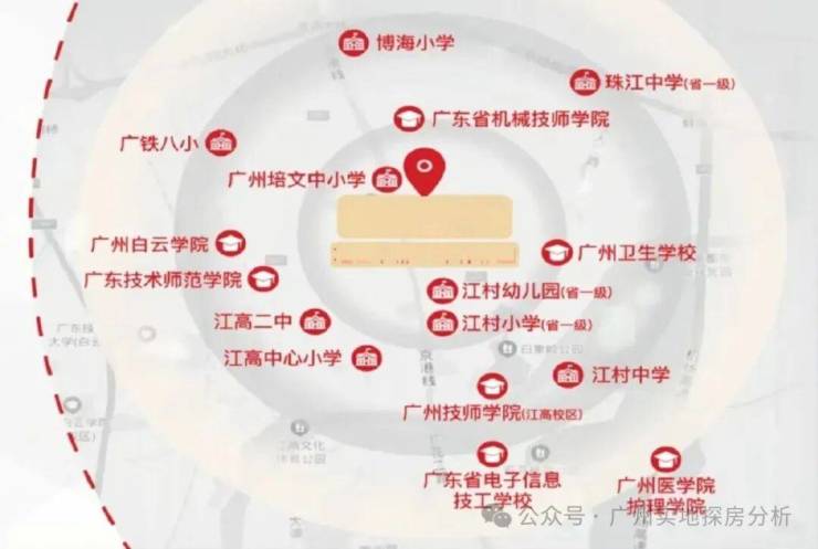项目周边如江高镇幼儿园省一级、江村小学省一级、江高镇中心小学、江高二中、江村中学、白云区珠江中学省一级等。