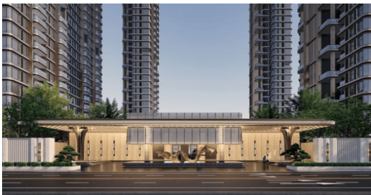 社区规划上,项目采用中轴对称的礼序布局,设贯穿南北的约330米园林通廊为轴,从气派主入口到两侧园境,一一呼应,打造“六门三堂”礼序归家体验。其中,光曜礼道为500米香樟归家礼道,林荫界域构筑私密归途;一城风华门为星级酒店式曜光礼遇,56米长、10米高的大门由花瓣状立柱支撑,两侧阵列两株罗汉松,入口两侧各十三片取自克罗地亚的弧形贝金米黄大理石,镌刻显贵仪制;江山华盖顶模拟钉金绣技法,将金线、银线交织成天曜的八芒星logo,彰显高端品质。
