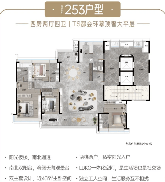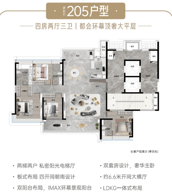 以建面约205㎡、253㎡的楼王单位为例,均采用专梯专户设计,私属电梯门厅保障尊崇隐私;双阳台布局,巨幕阳台宽度近9-10.3米,将中央园林与城市天际线尽收眼底;双主卧套房配置,赋予孩子更多独立成长空间;总统级主卧更配备步入式衣帽间、双台盆、独立浴缸,对标五星级酒店套房标准。