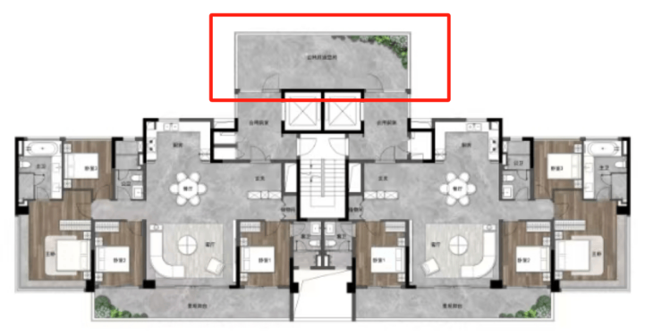 特殊亮点:首创“南北双庭院”体系,阳台占比最高30%,公共平台占比10%,不计容面积,户户空中庭院,使用率全线超130%,最高达143%。