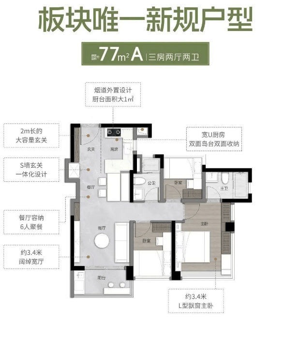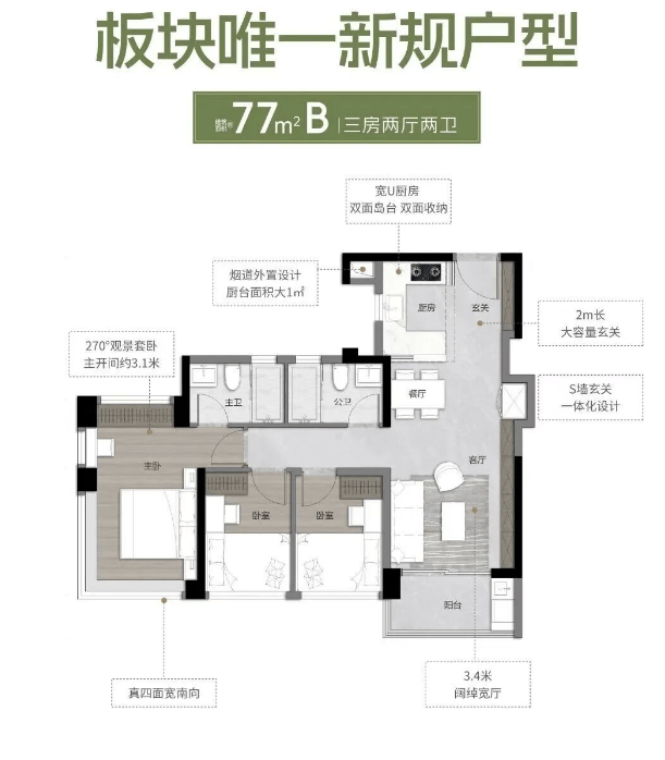 77㎡创意三房两卫:三面宽南向,通过270°全景舱主卧设计,客厅采用LDK公区方案,提升居住舒适度。