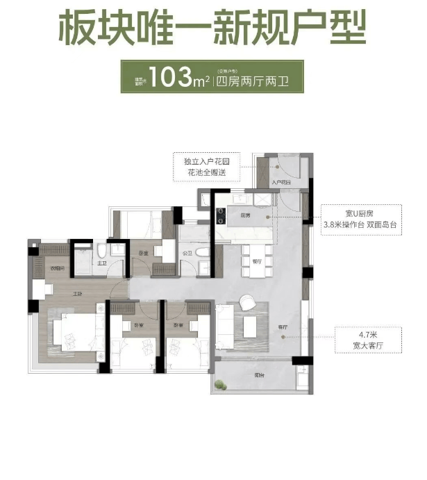 103㎡创意四房两卫:独立入户花园,带约7米通铺阳台,270°全景采光大主卧,南北对流设计。