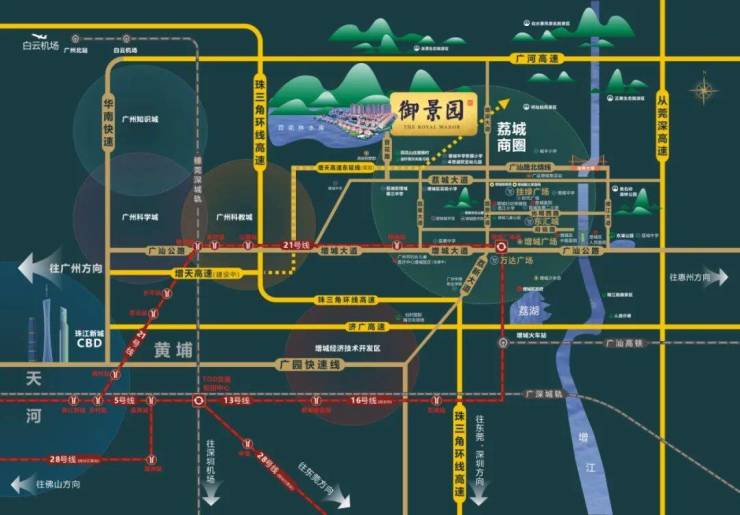 项目距离地铁21号线增城广场站步行约1.5公里,通过广州地铁网络可以便捷地到达市内各个区域。周边还有多条城际高速环绕,如珠三角环线、广河高速等,确保了出行的高效便捷。无论是日常通勤还是周末出游,这里都是一个理想的居住地点。