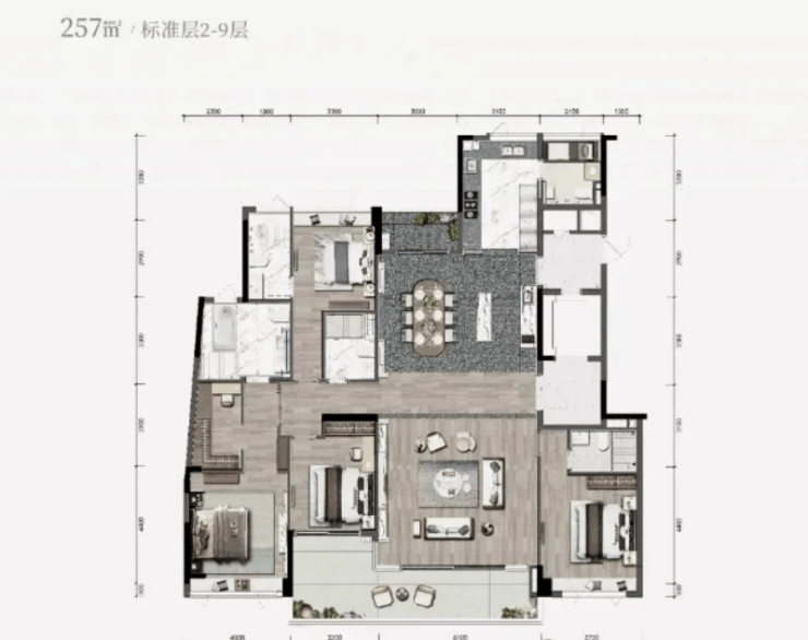 除了经典的280㎡户型,合景臻溋名铸还推出了267㎡至280㎡的南向大平层系列。这一系列产品同样延续了项目的高品质基因,并在细节上进行了进一步的优化。户型方正合理,动静分区明确,四房两厅三卫或四卫的布局,满足了不同家庭结构的多样化需求。其中,双套房的设计尤为贴心,主卧套房配备了独立的衣帽间和豪华卫浴,次卧套房则可以作为老人房或儿童房,让每一位家庭成员都能享受到专属的私密空间。