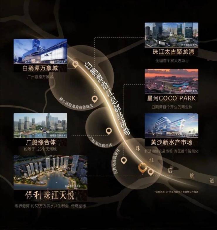 白鹅潭定位为“广州西翼CBD”,以200万平方米体量成为广州五大世界级商圈之首。这里不仅是环珠江经济带最后一片可以大规模连片开发的土地,也是除了珠江新城外唯一拥有重奢商业的商圈。保利珠江天悦坐拥这一黄金地段,独占约700米江岸线,将打造一个集休闲、娱乐、观光于一体的超大滨水综合体。