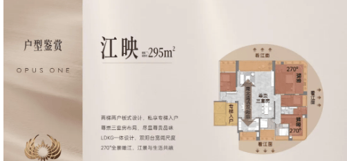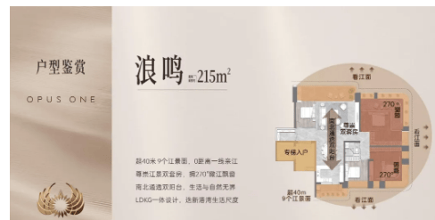 🔹170-215㎡户型(改善豪宅户型):三梯三户设计,保证私密性与采光通风。177㎡户型采用LDKB一体化设计,客厅开间约5.1米,打通相邻空间后可形成约8.2米超大开间,南向采光面达15米,四开间朝南。主卧面积约32㎡,带独立卫浴与步入式衣帽间,270°飘窗可俯瞰三江汇流景观,实测得房率达103%,部分房源实现双面江景视野。