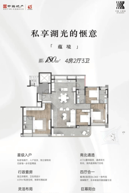 高得房率设计,享受宽敞居住体验:中海天幕湾推出的户型面积范围广泛,从180平方米到237平方米不等,均为两梯两户设计,专梯入户,确保住户的私密性和舒适度。户型采用LDKG一体化设计,部分户型更是拥有270°巨幕阳台,提供极佳的采光和视野。