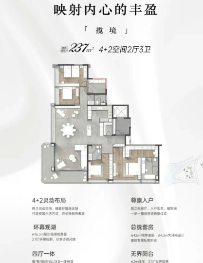 现代奢华风格,彰显尊贵品味:中海天幕湾采用了现代奢华的设计理念,强调建筑与自然环境的和谐统一。精装修交付标准确保每一个入住的家庭都能够享受到高品质的居住体验。特别值得一提的是,大部分户型都能享有270度环幕湖景,极大地提升了居住的视觉享受。