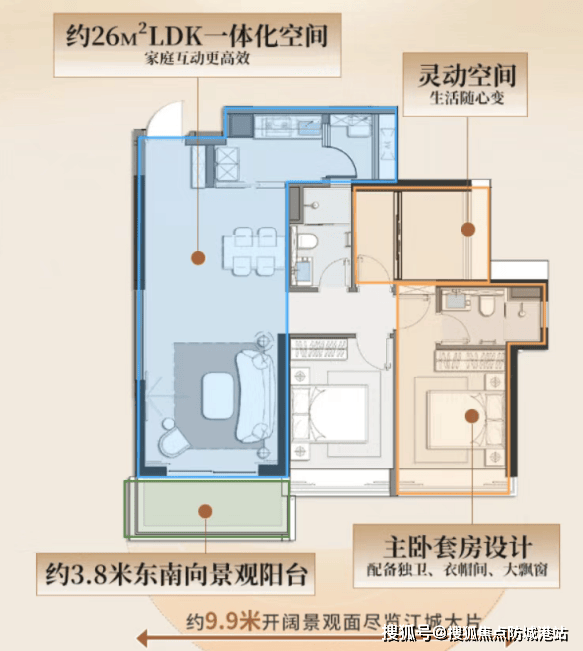 105㎡四房两卫:南北通透,LDK一体化社交核心区,20层以上享部分江景,适配二胎家庭。