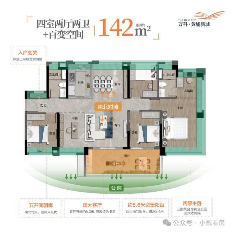 “中央公园”,紧邻大脚印公园,距离地铁约500米,紧邻学校、酒店,户型涵盖75-88㎡三房,105、125、142㎡四房