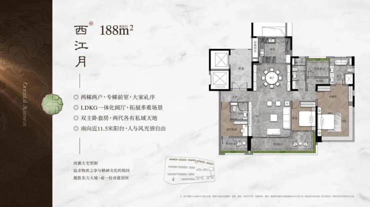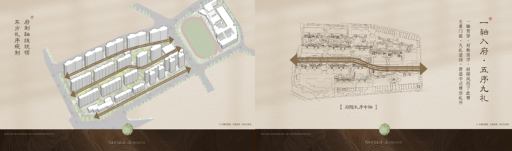 项目以“东方气韵为魂,现代精工为骨”为核心设计理念,摒弃传统中式符号的堆砌,萃取中国传统建筑对称布局、园林借景等精髓,结合现代材料与工艺,打造“去朝代化”的中式美学人居,实现骨子里的中国文化自信。社区采用“一轴三境五序九礼”的空间序列,营造层层递进的院落景观,呈现“府院国风”的独特美感。