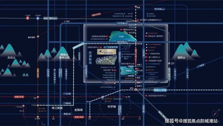 根据广州市规划和自然资源局2025年公示,知识城·悦辰壹号位于中新知识城南起步区,地处凤凰湖与九龙湖双湖交汇的“黄金三角区”。项目所在区域被定位为“环九龙湖总部经济带核心区”,未来将聚焦总部经济、科技创新、国际教育三大产业,规划建设知识塔(330米地标)、文化塔等超高层建筑群,预计2025年区域年产值突破3000亿元。