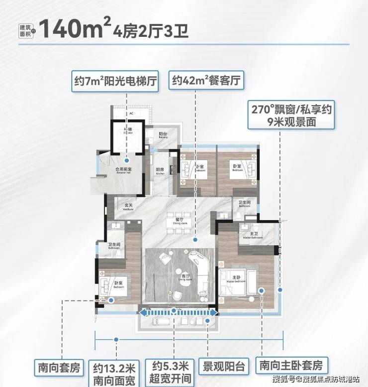 经第三方实测机构认证(穗测房〔2024〕076号),越秀观樾得房率达110%-120%,较同区域竞品高出15%-20%。以140㎡户型为例,实际使用面积比同类产品多出约18㎡;250㎡户型配备15米转角阳台,直面3.3万㎡太阳湖,奢阔层高搭配可改造承重墙设计,满足高端客群定制化需求。