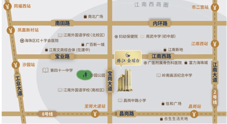 珠江·金瑶台交通便捷,项目距离地铁8号线宝岗大道站约500米,步行约5至8分钟即可抵达,20分钟直达珠江新城商务中心。同时距离地铁2号线江南西站约800米,快速连通广州南站及其他城市枢纽。项目依托宝岗大道主干道,连接江南大道及工业大道,实现自驾快速通达城市各主要板块,18分钟可抵珠江新城,兼顾高效通勤与生活便利。