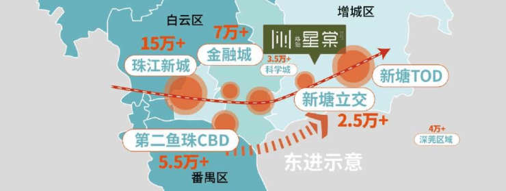新塘的第一梯队,距离老黄埔中心仅一站地铁,距离珠江新城约34KM(约40分钟),三大高速快速通达黄埔天河;
