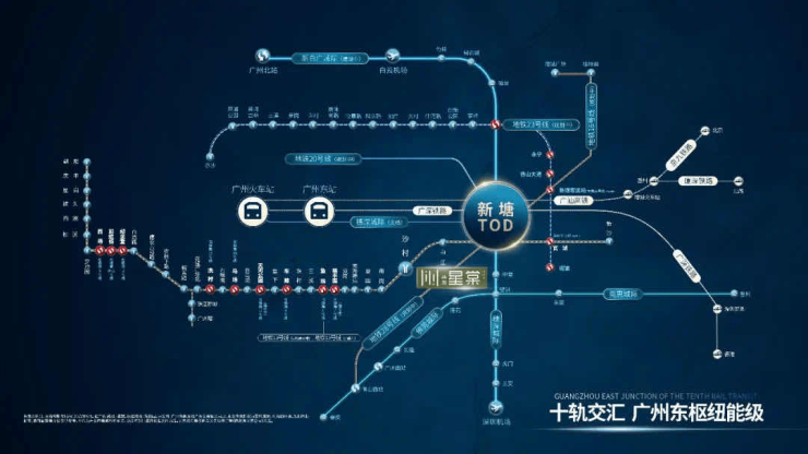 一站新塘TOD,汇聚10条轨道:5条地铁【13号线(一期已建成、二期建设中)、16号线*、28号线*、20号线*、23号线*】连通广州中心、2条城际轻轨【穗莞深*、新白广*】连接大湾区城市群、3条高铁【广深铁路(已建成)、广汕铁路(建设中)、京九铁路*】连通省际,互通2大国际机场,日均人流量将达80万