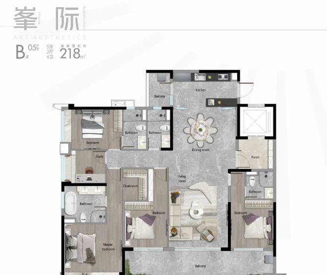 建面约218㎡四房两厅三卫户型,是项目的高端改善户型,适合多代同堂、高端改善家庭居住,彰显品质与尊崇。该户型尺度奢阔,空间布局合理,功能齐全,能够满足高端家庭的多元化居住需求。户型采用南北通透设计,采光通风极佳,客厅开间宽敞,连接超大观景阳台,视野开阔,可欣赏社区园林景观和周边风光,适合家庭聚会、高端接待等多种场景;主卧套房设计,配备独立卫浴、衣帽间和观景飘窗,空间阔绰,私密性强,彰显主人的尊崇身份;次卧均为独立套房设计,配备独立卫浴,兼顾家人的私密性和舒适度,让每一位家人都能拥有舒适的居住空间;厨房采用U型设计,空间充足,适配日常烹饪和家庭聚餐需求;精细化收纳设计,遍布全屋,充分满足高端家庭的储物需求,让家居环境更加整洁有序。